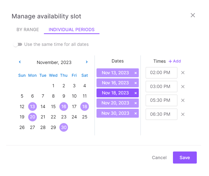 With availability rules, you have total and fine control of when your sessions happen and how frequently.