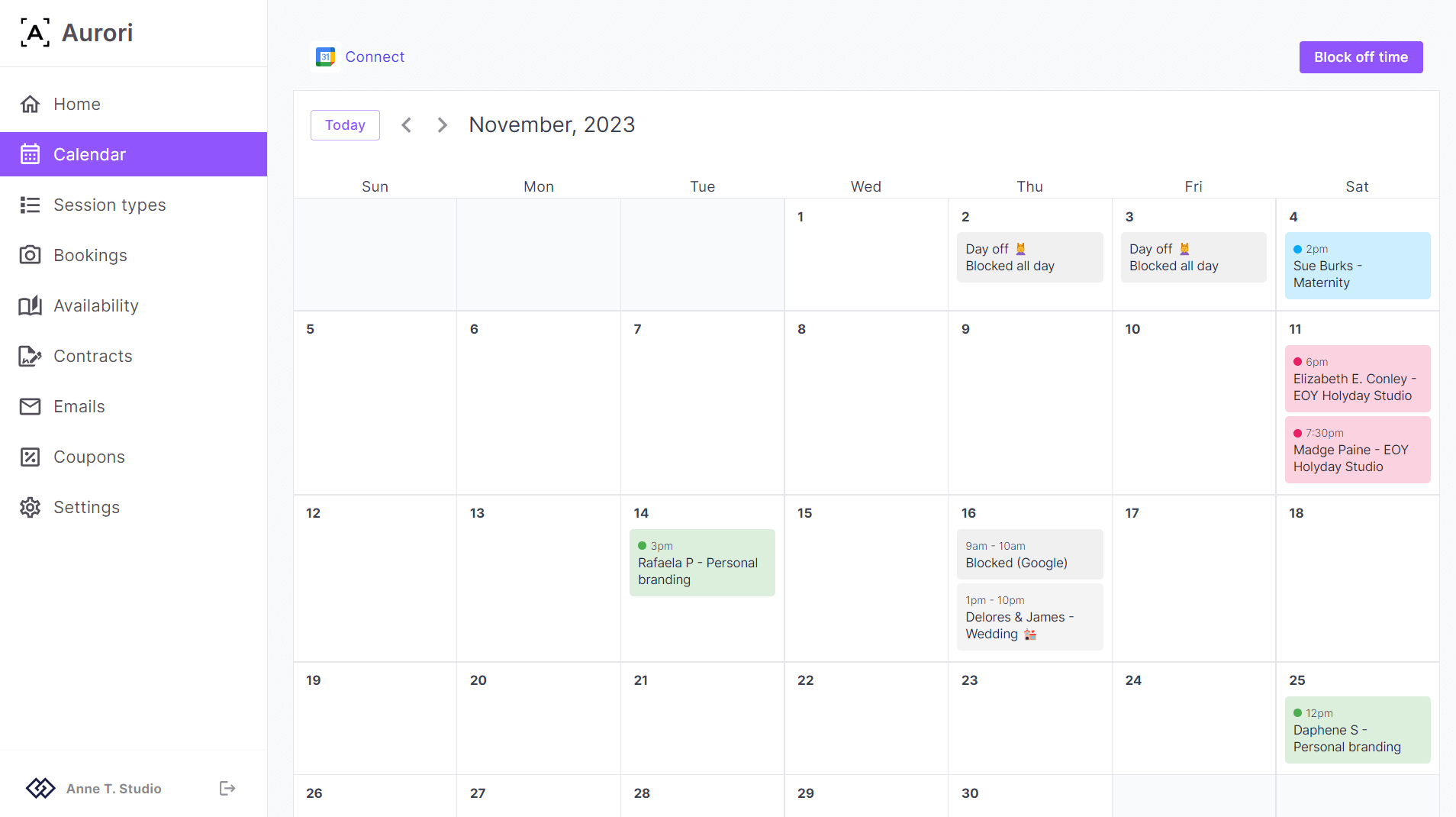 Aurori is a booking platform for your photography and video business that's simple to use, with no complicated workflows. Book clients, get paid and manage your calendar.