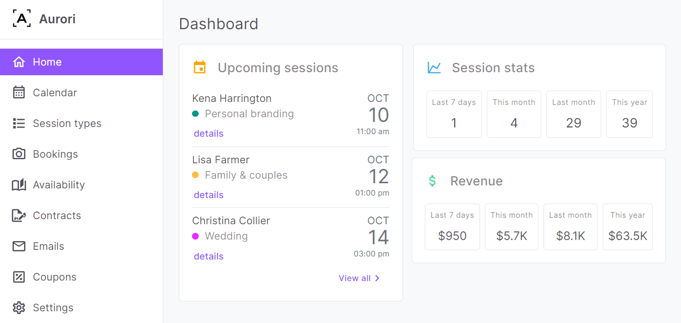 Aurori is a powerful tool for you to keep the business organized. No matter what kind of photography you shoot, your clients will always have a great booking experience.